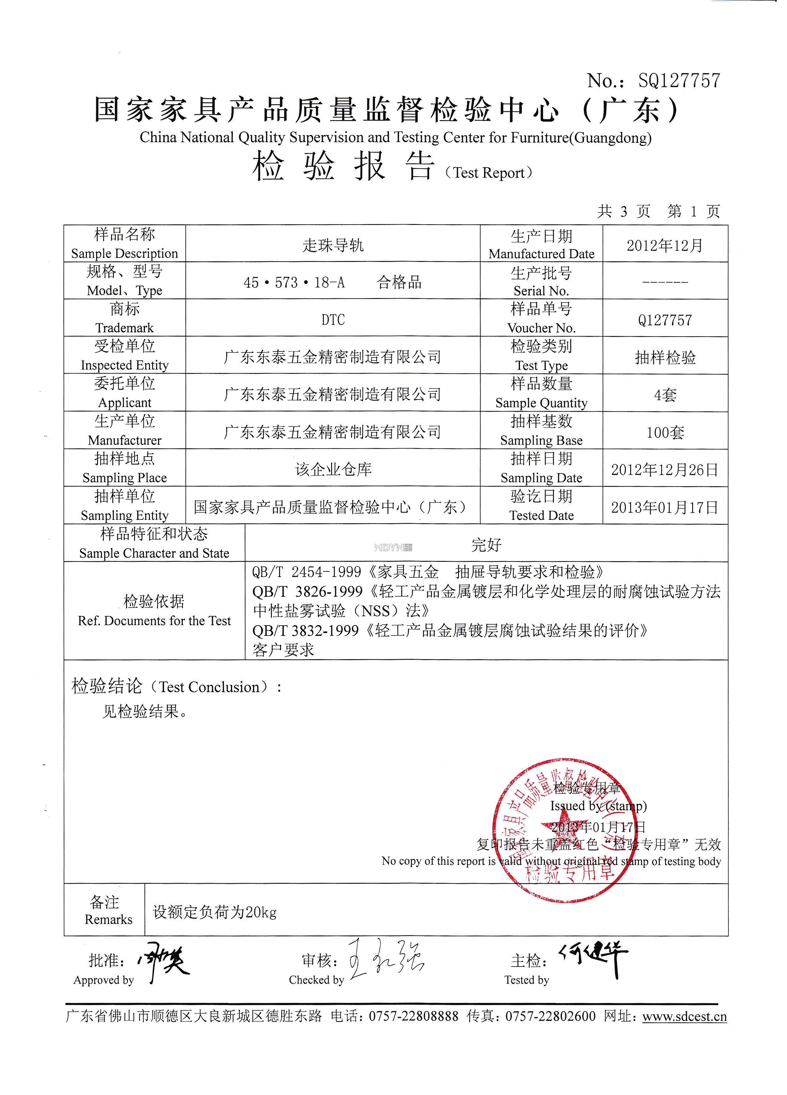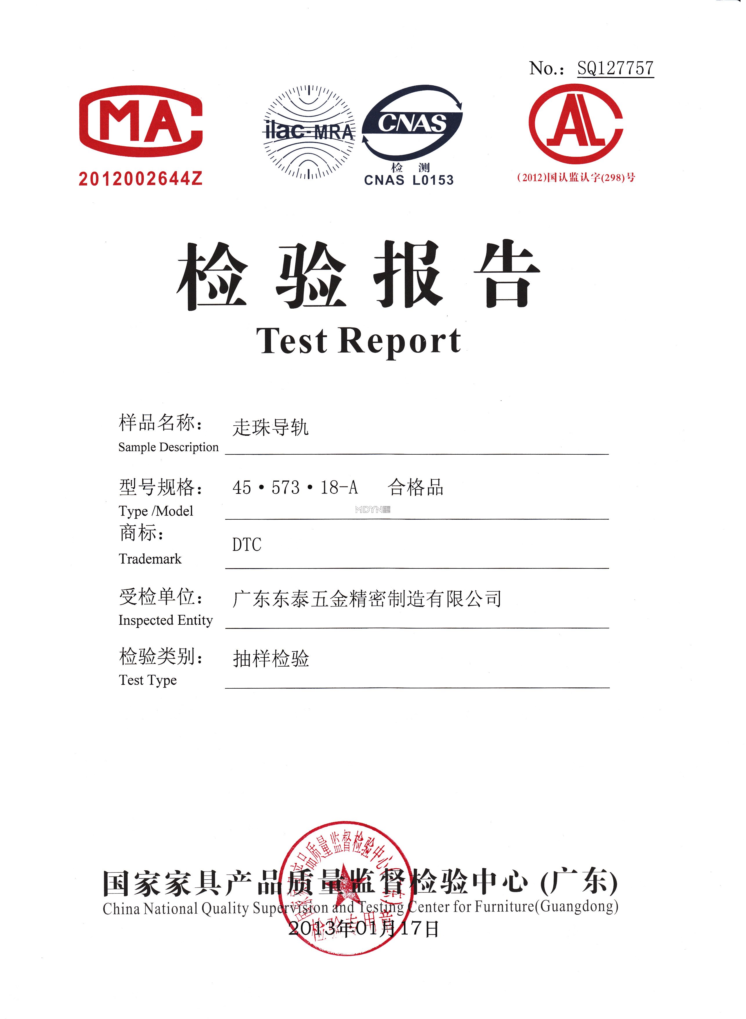 五金導軌檢測證書